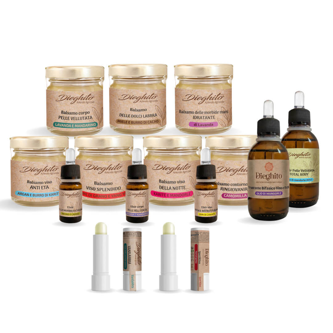 Un rituale completo per il viso: lo Struccante Bifasico (2 pezzi) libera con delicatezza, il Tonico ai Semi di Canapa (2 pezzi) prepara la pelle, il Balsamo Viso Splendido dona luce con mezzo chicco di riso, il Contorno Occhi alla Camomilla distende lo sguardo, il Balsamo Viso Anti-Age Argan e Karité nutre e sostiene la pelle matura, e il Balsamo della Notte lavora mentre dormi.