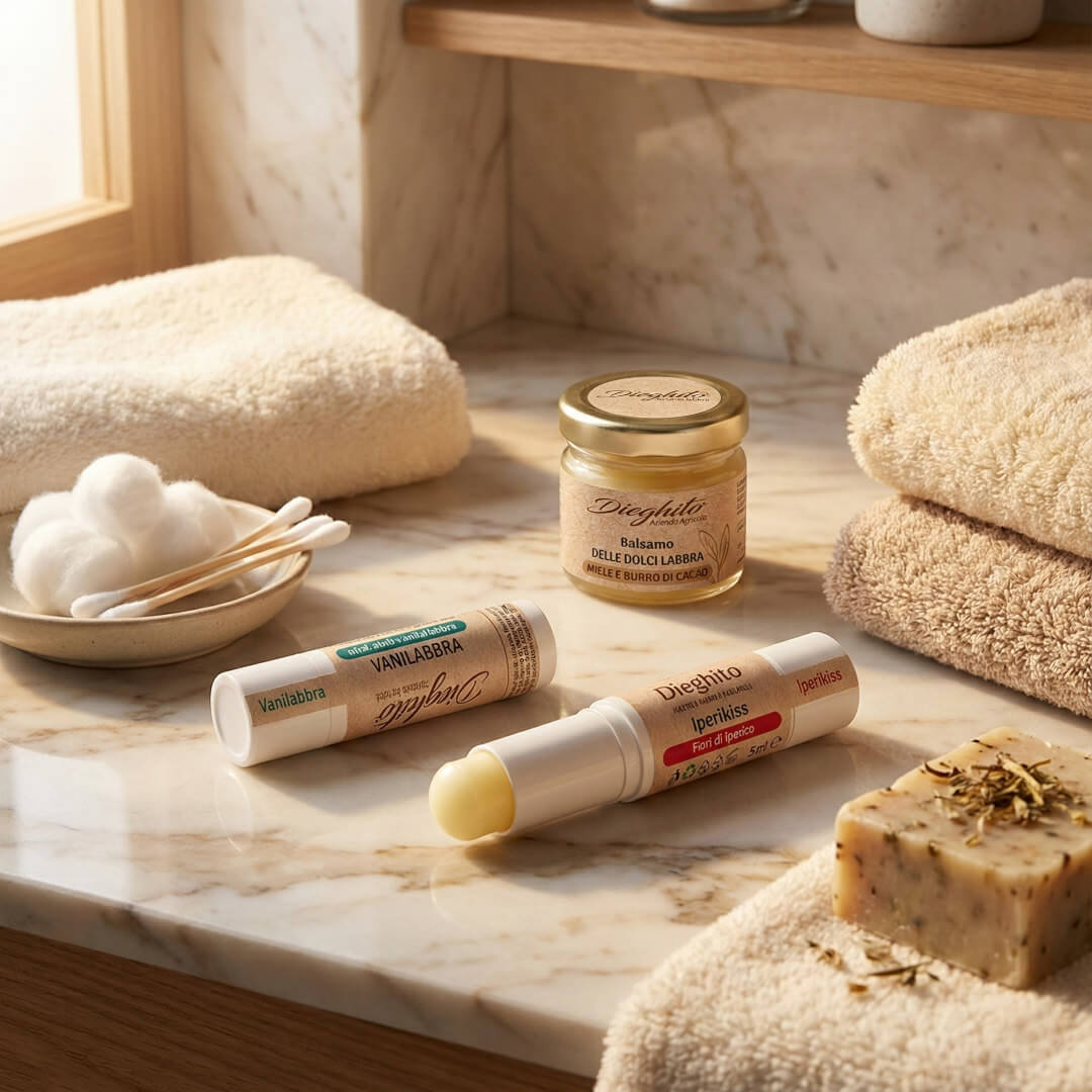 Iperikiss se vuoi protezione naturale, Vanilabbra se cerchi dolcezza quotidiana, o il Balsamo Dolci Labbra se senti la pelle più secca.