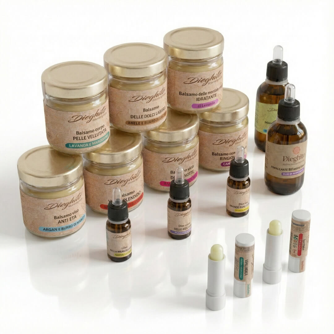 Per questo abbiamo riunito 16 prodotti artigianali in un unico rituale head-to-toe, fatto a mano in Sardegna con botaniche mediterranee e infusioni lente. Le texture sono morbide, l’assorbimento è rapido, le quantità sono minime: mezzo chicco di riso per il viso, una puntina per gli occhi, due gocce per i capelli.